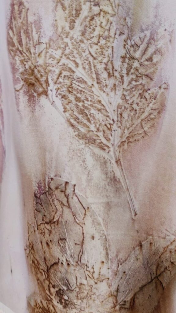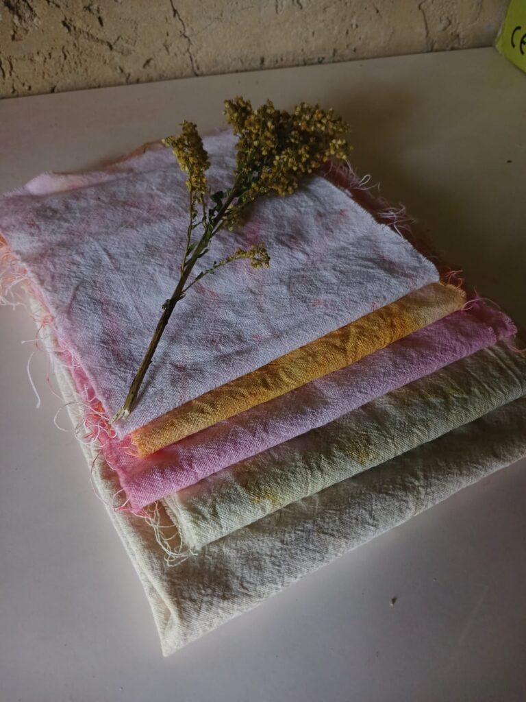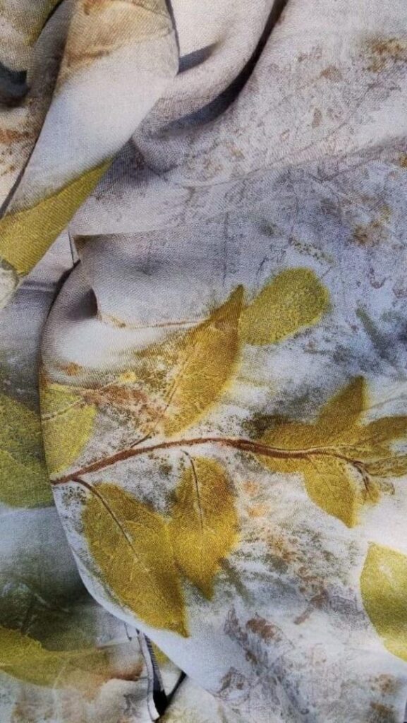 Aunque en la carrera de diseño de modas había visto el estampado botánico de manera muy superficial, este encuentro fue distinto. Empezó a investigar, a estudiar, a experimentar. Error, acierto, error, acierto… durante años. Y aún hoy, sigue aprendiendo, porque es un arte inagotable, vivo, que cambia según la planta, el clima, la luna, su propia energía.
