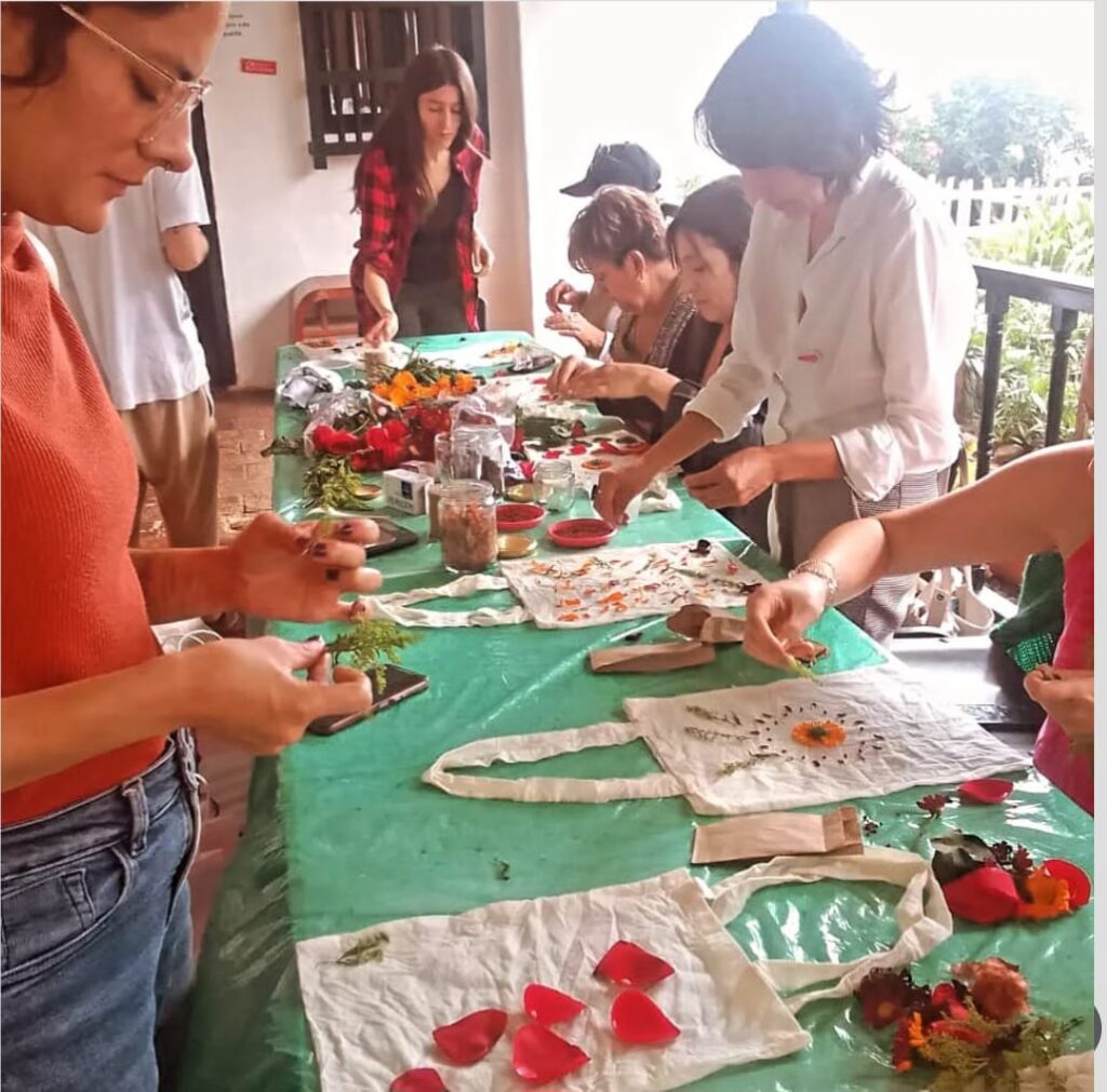 Además de crear prendas, su mayor propósito es enseñar. A través de talleres o como ella las llama: experiencias botánicas, acompaña a las personas a descubrir este arte, no solo desde la técnica, sino desde la presencia. Les enseña a estampar, a fijar bien el color, a preparar las fibras, pero también a conectar con la planta, con su historia, con el momento.