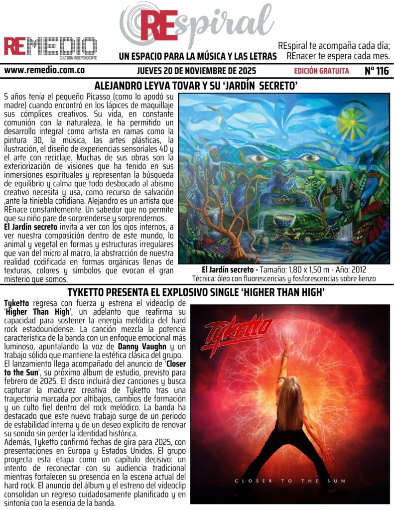 RESPIRAL . Boletín 116 – 11.20.2025 Jueves noviembre 20/2025 elremedioderocko@gmail.com REspiral 0 Email * Suscribirse Alejandro Leyva TovarCloser to the SunDanny VaughnEl jardín secretoTyketto