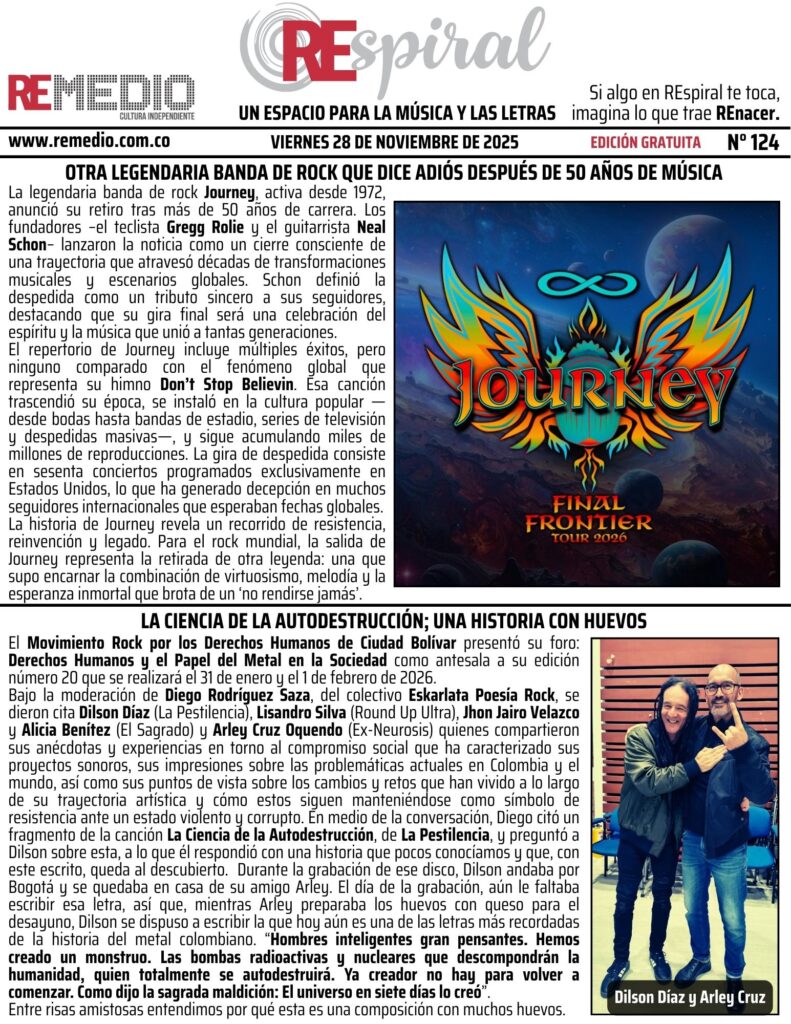 RESPIRAL . Boletín 124 – 11.28.2025 Viernes noviembre 28/2025 elremedioderocko@gmail.com REspiral 0 Email * Suscribirse Alicia BenítezDiego Rodríguez SazaDon't Stop BelievinFinal Frontier Tour 2026Gregg RolieJhon Jairo VelazcoJourneyJuan Carlos PrietoLa Ciencia de la AutodestrucciónLisandro SilvaMovimiento Rock por los Derechos Humanos de Ciudad BolívarNeal SchonRound Up Ultra
