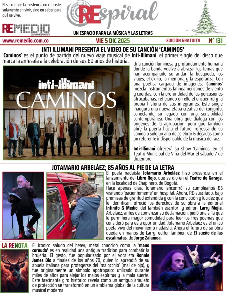 RESPIRAL . Boletín 131 – 12.5.2025 Viernes diciembre 5/2025 elremedioderocko@gmail.com REspiral 0 Email * Suscribirse CaminosEl sueño de las escalinatasInfinito & MedioInti IllimaniJorge ZalameaJotamario ArbeláezLarry MejíaRonnie James Dio