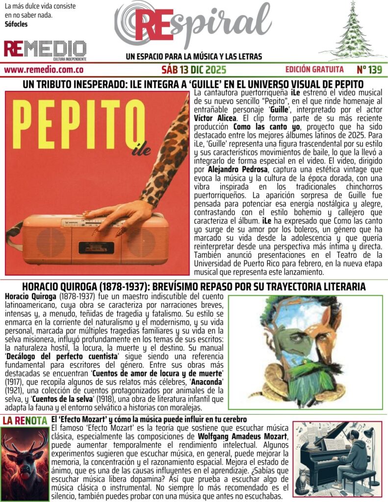 RESPIRAL . Boletín 139 – 12.13.2025 Sábado diciembre 13/2025 elremedioderocko@gmail.com REspiral 0 Email * Suscribirse Como las canto yoCuentos de amor de locura y de muerteCuentos de la SelvaDecálogo del perfecto cuentistaHoracio QuirogaiLéPepitoWolfgang Amadeus Mozart