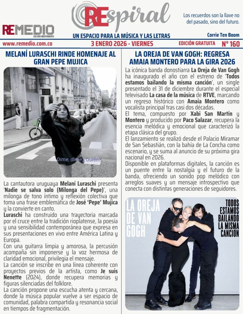RESPIRAL . Boletín 160 – 1.3.2026 Sábado enero 4/2026 elremedioderocko@gmail.com REspiral 0 Email * Suscribirse Amaia MonteroLa Oreja de Van GoghMelaní LuraschiNadie se salva soloPepe MujicaTodos estamos bailando la misma canciónXabi San Martín