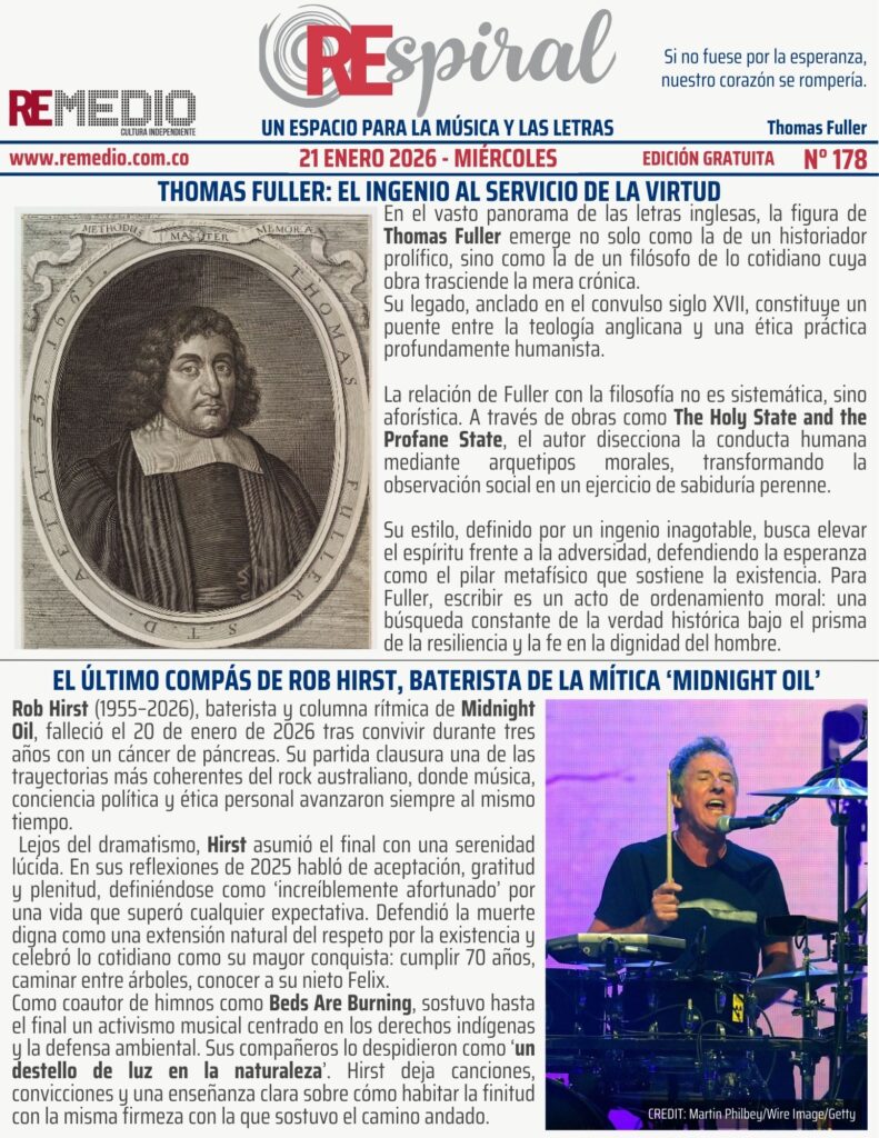 RESPIRAL . Boletín 178 – 1.21.2026 Miércoles enero 21/2026 elremedioderocko@gmail.com REspiral 0 Email * Suscribirse Beds Are BurningMidnight OilRob HirstThe Holy State and the Profane StateThomas FullerUn destello de Luz en la naturaleza