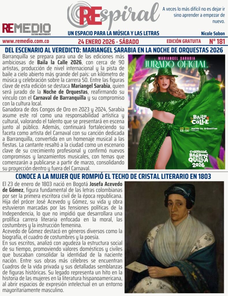 RESPIRAL . Boletín 181 – 1.24.2026 Sábado enero 24/2026 elremedioderocko@gmail.com REspiral 0 Email * Suscribirse Baila la Calle 2026Carnaval de BarranquillaJosefa Acevedo de GómezMariangel SarabiaNoche de Orquestas 2026