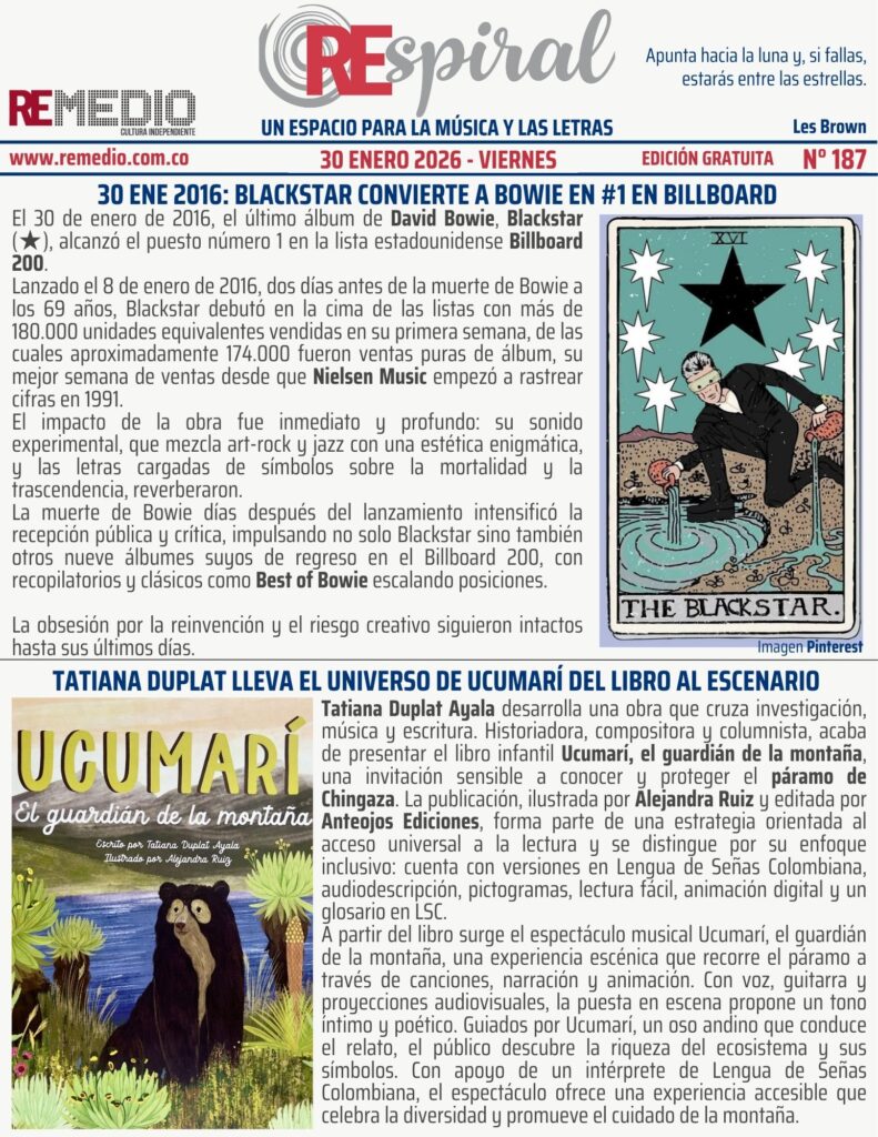 RESPIRAL . Boletín 187 – 1.30.2026 Viernes febrero 3/2026 elremedioderocko@gmail.com REspiral 0 Email * Suscribirse Anteojos EdicionesBillboardBlackstarBowieDavid BowieLes BrownNielsen MusicPáramo de ChingazaTatiana DuplatUcumarí El Guardián de la Montaña