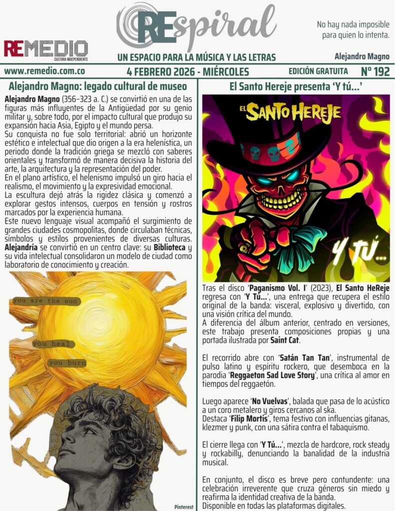 RESPIRAL . Boletín 192 – 2.4.2026 Miércoles febrero 6/2026 elremedioderocko@gmail.com REspiral 0 Email * Suscribirse Alejandro MagnoBiblioteca de AlejandríaEl Santo HerejeFilip MortisReggaeton Sad Love StorySaint CatSatán Tan TanY tú...