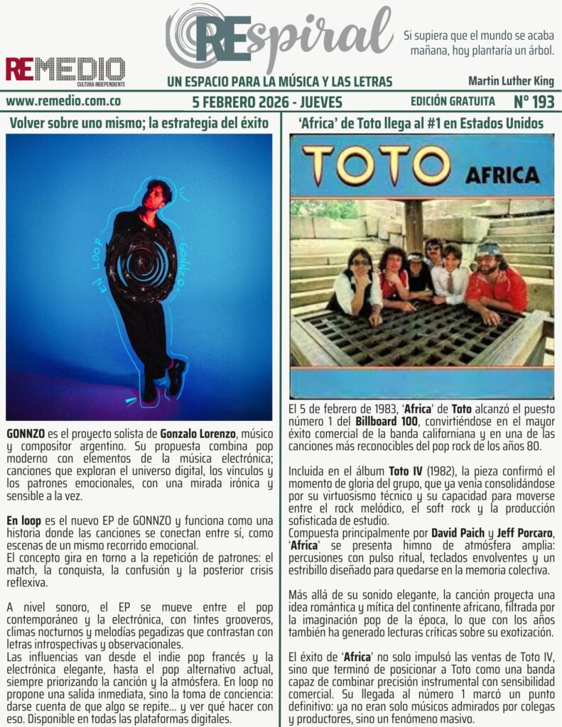 RESPIRAL . Boletín 193 – 2.5.2026 Jueves febrero 6/2026 elremedioderocko@gmail.com REspiral 0 Email * Suscribirse AfricaEn loopGONNZOJeff PorcaroToto