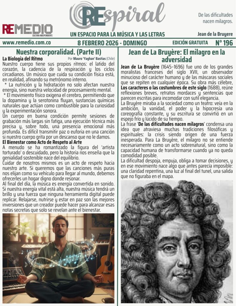 RESPIRAL . Boletín 196 – 2.8.2026 Domingo febrero 11/2026 elremedioderocko@gmail.com REspiral 0 Email * Suscribirse De las dificultades nacen milagrosEl Bienestar como Acto de Respeto al ArteJean de la BruyereLa Biología del RitmoLos caracteres o las costumbres de este sigloMauro Bastias. Chile
