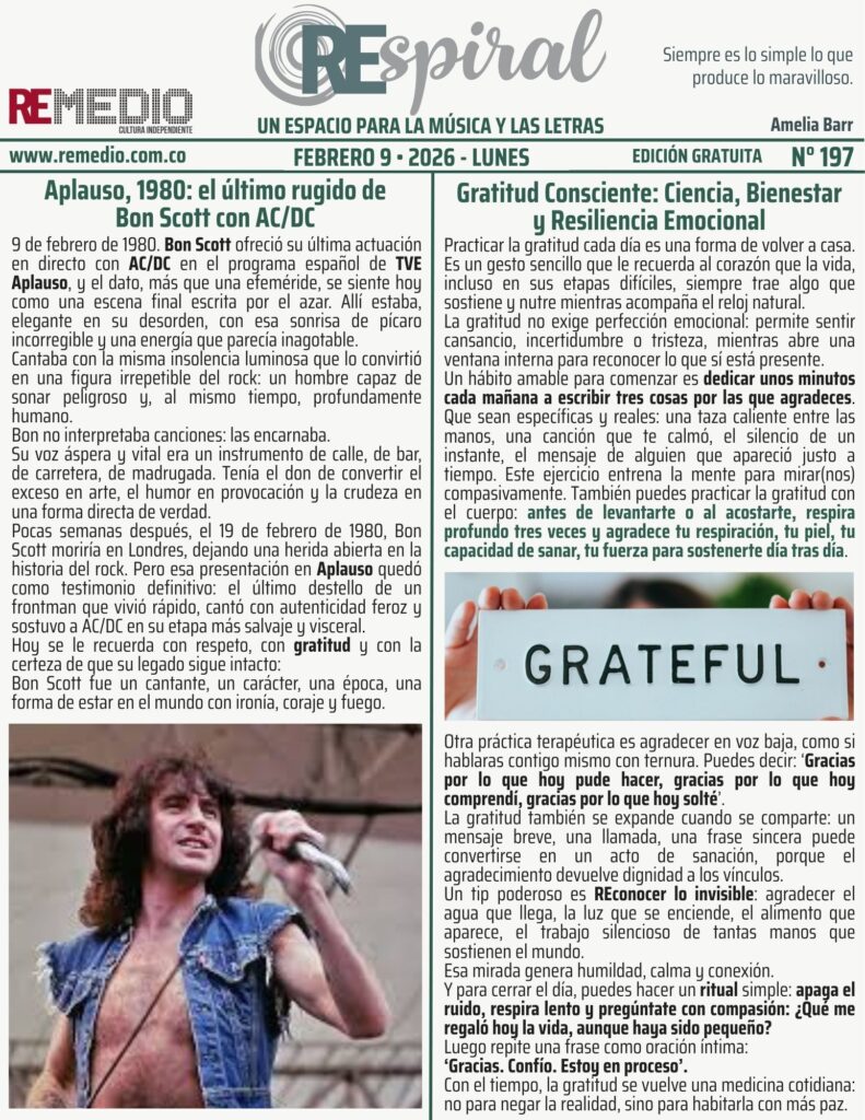RESPIRAL . Boletín 197 – 2.9.2026 Lunes febrero 11/2026 elremedioderocko@gmail.com REspiral 0 Email * Suscribirse ACDCAplauso 1980Gratitud ConscienteResiliencia Emocional