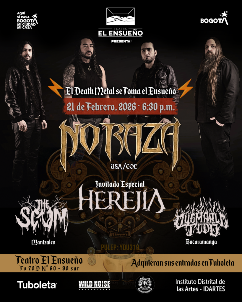 Bogotá vivirá una noche dedicada a la fuerza, la memoria y la vigencia del metal extremo colombiano en el DEATH METAL SE TOMA EL ENSUEÑO, con la presentación de NO RAZA (USA,COL), Herejía (Bogotá), The Scum (Manizales) y Quemarlo Todo (Bucaramanga), cuatro bandas fundamentales de la escena nacional que se reunirán en el Teatro El Ensueño en un evento que celebra la diversidad, la trayectoria y el presente del metal hecho en Colombia.