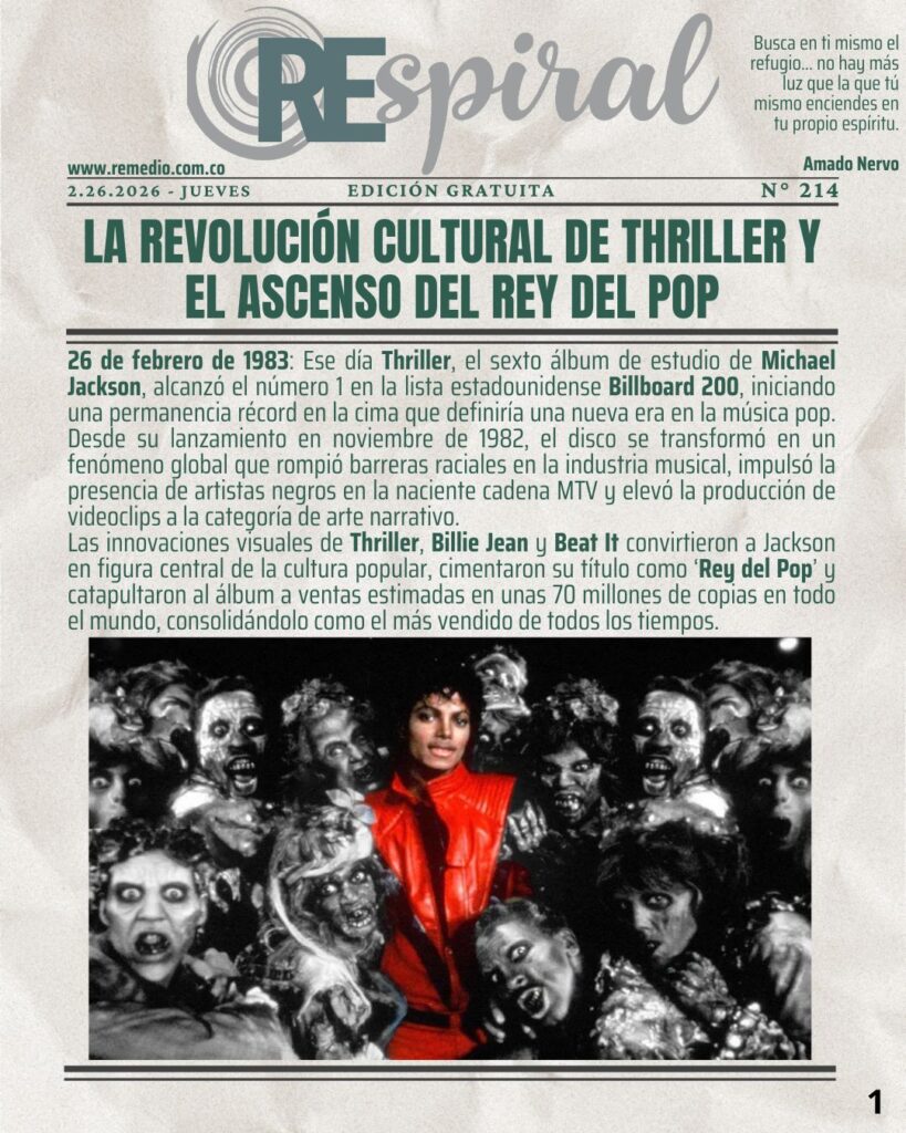 RESPIRAL . Boletín 214 – 2.26.2026 Jueves febrero 26/2026 elremedioderocko@gmail.com REspiral 0 Email * Suscribirse 56 days56 díasBeat ItBillboard 200Dove CameronEl Rey del PopMichael JacksonThriller