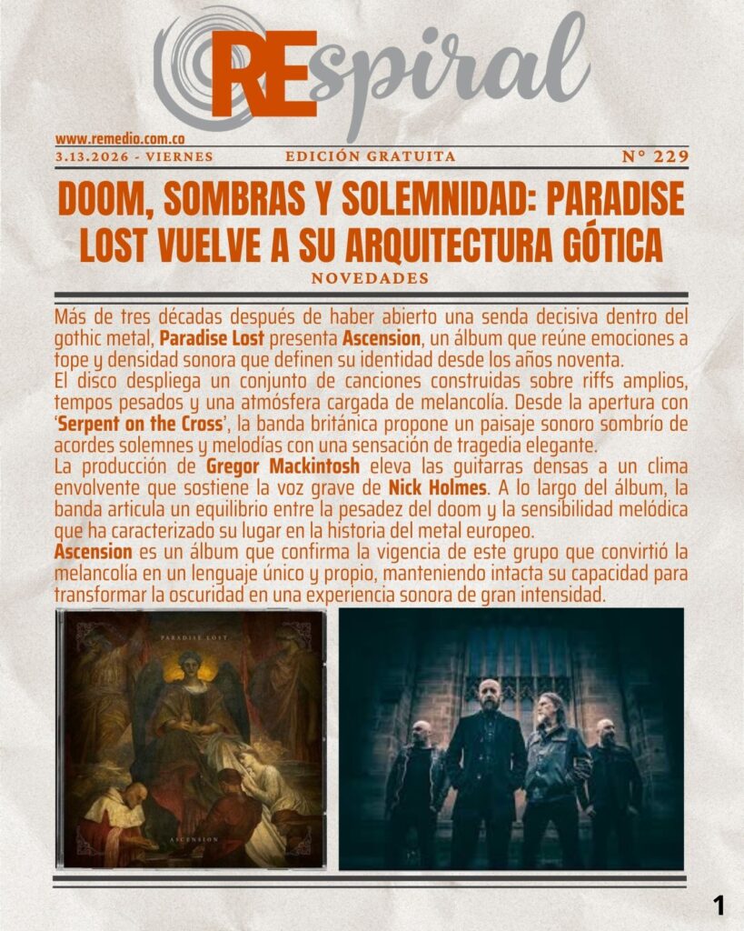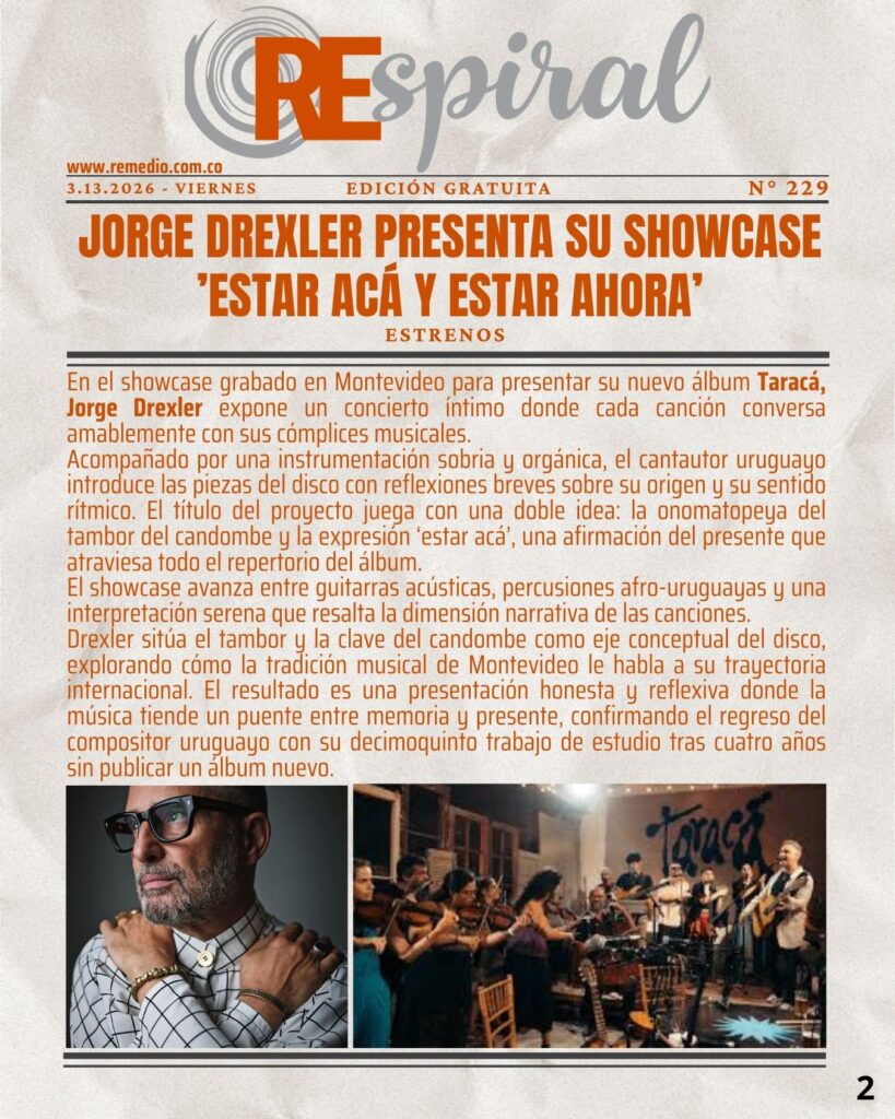 RESPIRAL . Boletín 229 – 3.13.2026 Viernes marzo 17/2026 elremedioderocko@gmail.com REspiral 0 Email * Suscribirse Jorge DrexlerParadise LostSerpent on the CrossTaracá
