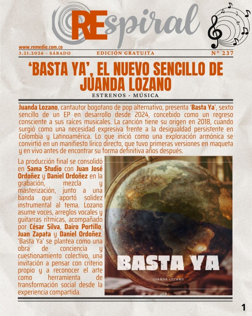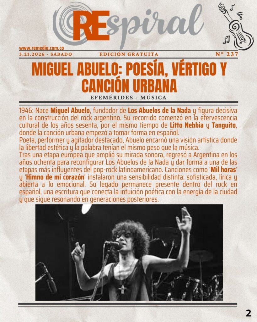RESPIRAL . Boletín 237 – 3.21.2026 Sábado abril 1/2026 elremedioderocko@gmail.com REspiral 0 Email * Suscribirse Dairo PortilloDaniel OrdóñezHimno de mi CorazónJuanda LozanoLitto NebbiaMiguel AbueloSama Studio