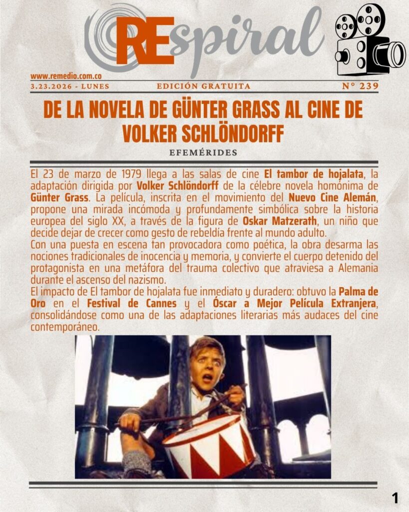 RESPIRAL . Boletín 239 – 3.23.2026 Lunes abril 1/2026 elremedioderocko@gmail.com REspiral 0 Email * Suscribirse CEFE ChapineroEl tambor de hojalataFestival de CannesGünter GrassLATIR Festival 2026Nuevo Cine AlemánPlama de OroTeatro al Aire Libre La Media TortaVolker Schölndorff