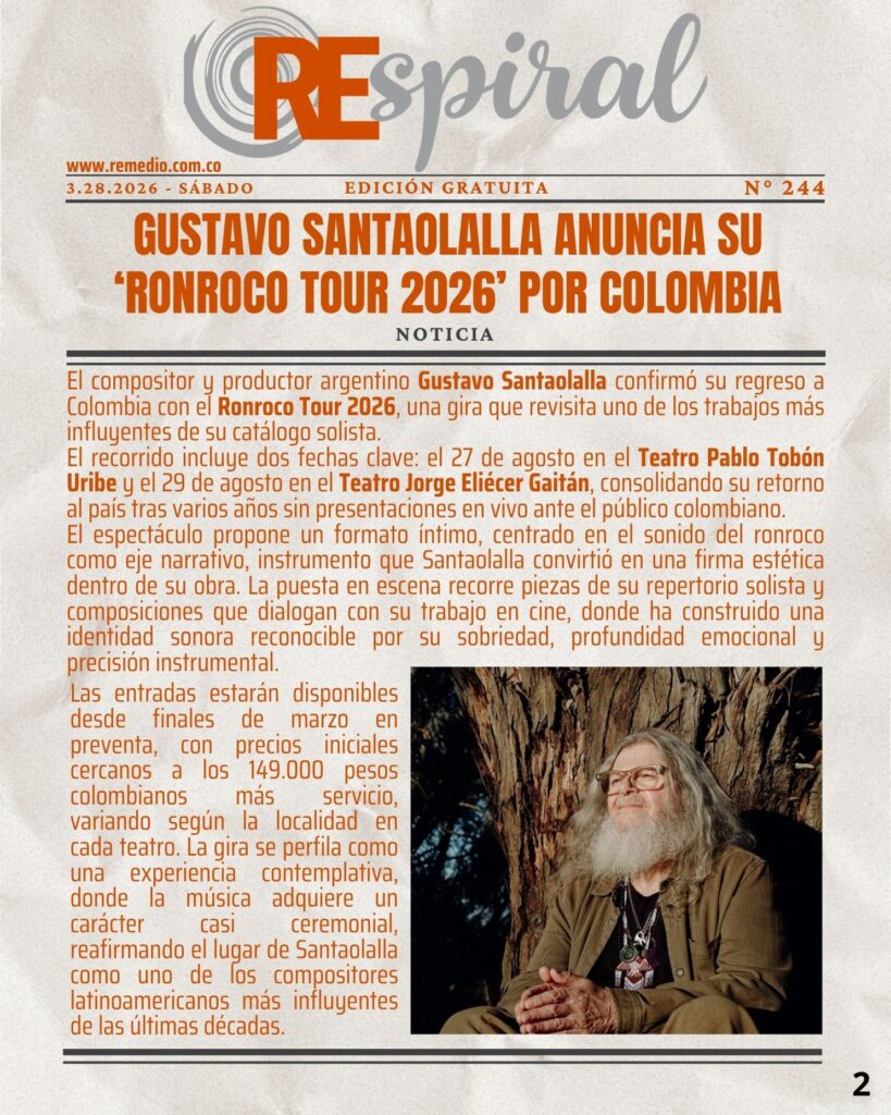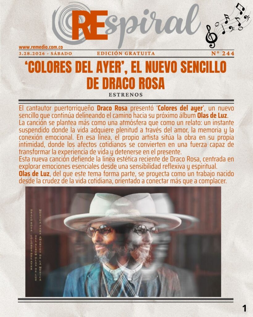 RESPIRAL . Boletín 244 – 3.28.2026 Sábado abril 1/2026 elremedioderocko@gmail.com REspiral 0 Email * Suscribirse Draco RosaGustavo SantaolallaOlas de LuzRonroco Tour 2026Teatro Jorge Eliécer GaitánTeatro Pablo Tobón Uribe