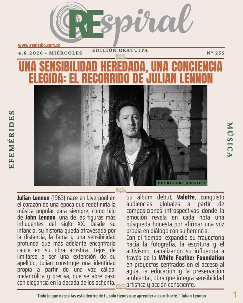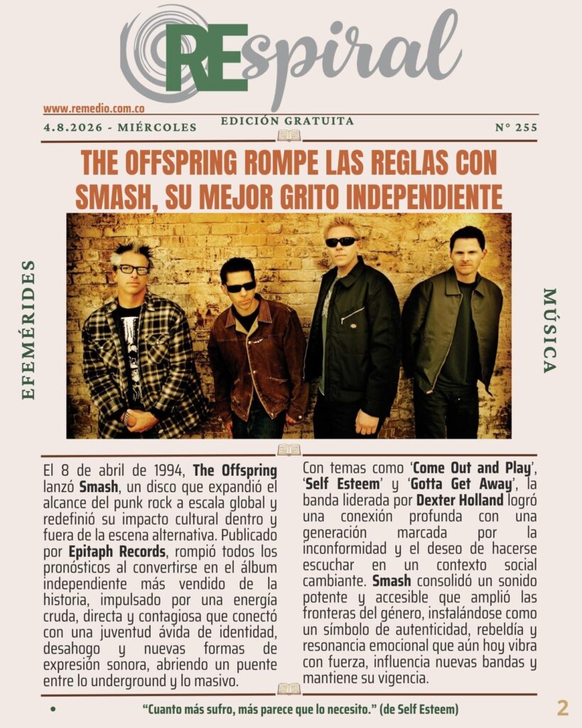 RESPIRAL . Boletín 255 – 4.8.2026 Miércoles abril 9/2026 elremedioderocko@gmail.com REspiral 0 Email * Suscribirse Dexter HollandEpitaph RecordsJulian LennonSelf EsteemSmashThe OffspringValotteWhite Feather Foundation