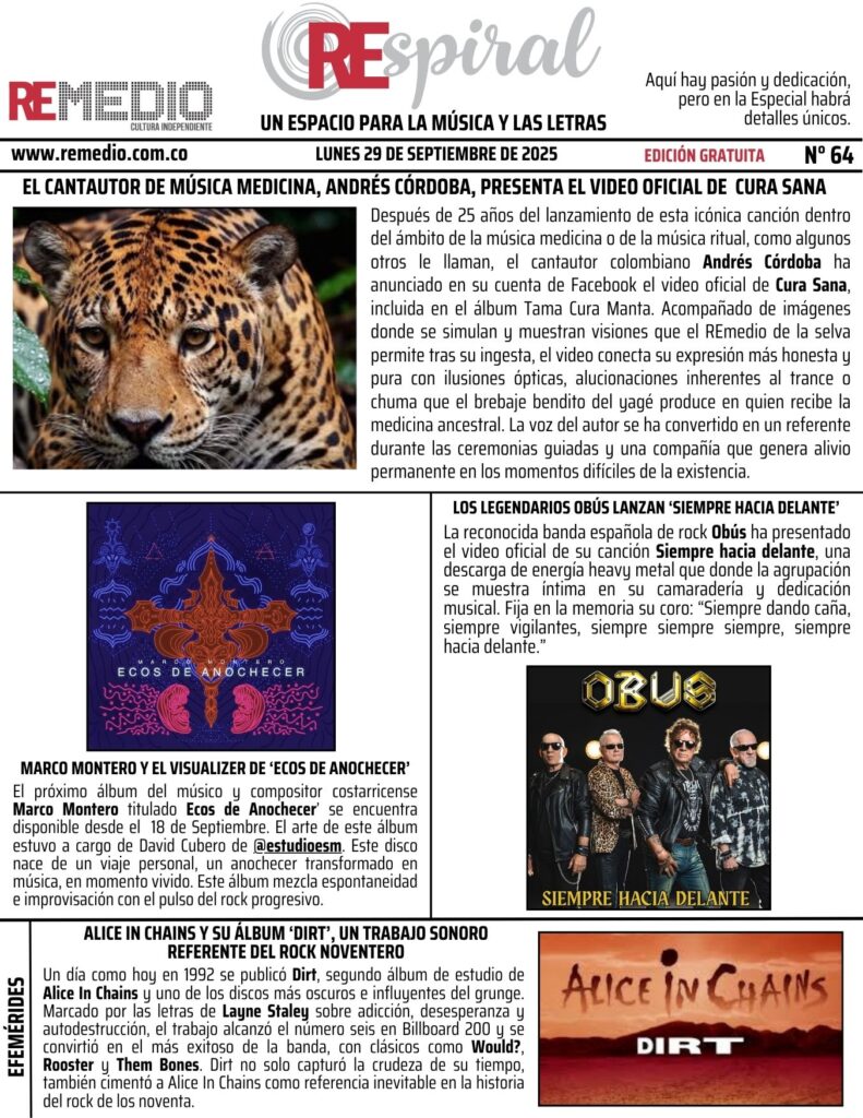 Después de 25 años del lanzamiento de esta icónica canción dentro del ámbito de la música medicina o de la música ritual, como algunos otros le llaman, el cantautor colombiano Andrés Córdoba ha anunciado en su cuenta de Facebook el video oficial de Cura Sana, incluida en el álbum Tama Cura Manta. Acompañado de imágenes donde se simulan y muestran visiones que el REmedio de la selva permite tras su ingesta, el video conecta su expresión más honesta y pura con ilusiones ópticas, alucionaciones inherentes al trance o chuma que el brebaje bendito del yagé produce en quien recibe la medicina ancestral. La voz del autor se ha convertido en un referente durante las ceremonias guiadas y una compañía que genera alivio permanente en los momentos difíciles de la existencia.