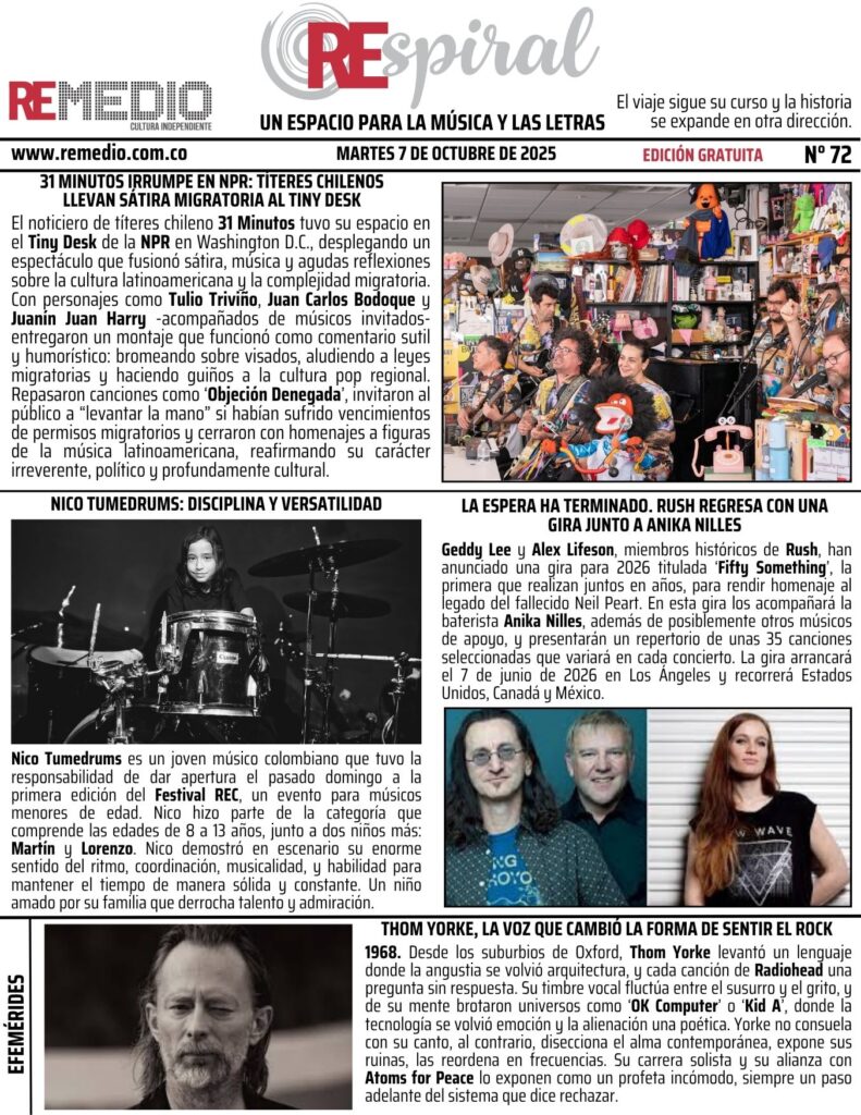 El noticiero de títeres chileno 31 Minutos tuvo su espacio en el Tiny Desk de la NPR en Washington D.C., desplegando un espectáculo que fusionó sátira, música y agudas reflexiones sobre la cultura latinoamericana y la complejidad migratoria. Con personajes como Tulio Triviño, Juan Carlos Bodoque y Juanín Juan Harry -acompañados de músicos invitados- entregaron un montaje que funcionó como comentario sutil y humorístico: bromeando sobre visados, aludiendo a leyes migratorias y haciendo guiños a la cultura pop regional. Repasaron canciones como ‘Objeción Denegada’, invitaron al público a “levantar la mano” si habían sufrido vencimientos de permisos migratorios y cerraron con homenajes a figuras de la música latinoamericana, reafirmando su carácter irreverente, político y profundamente cultural.